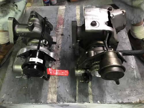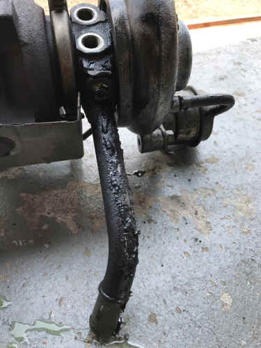 ターボのリターンのホースかガスケット辺りが漏れの原因かもしれませんけど、シャフトのガタも大きいので、リビルト品に交換しました。